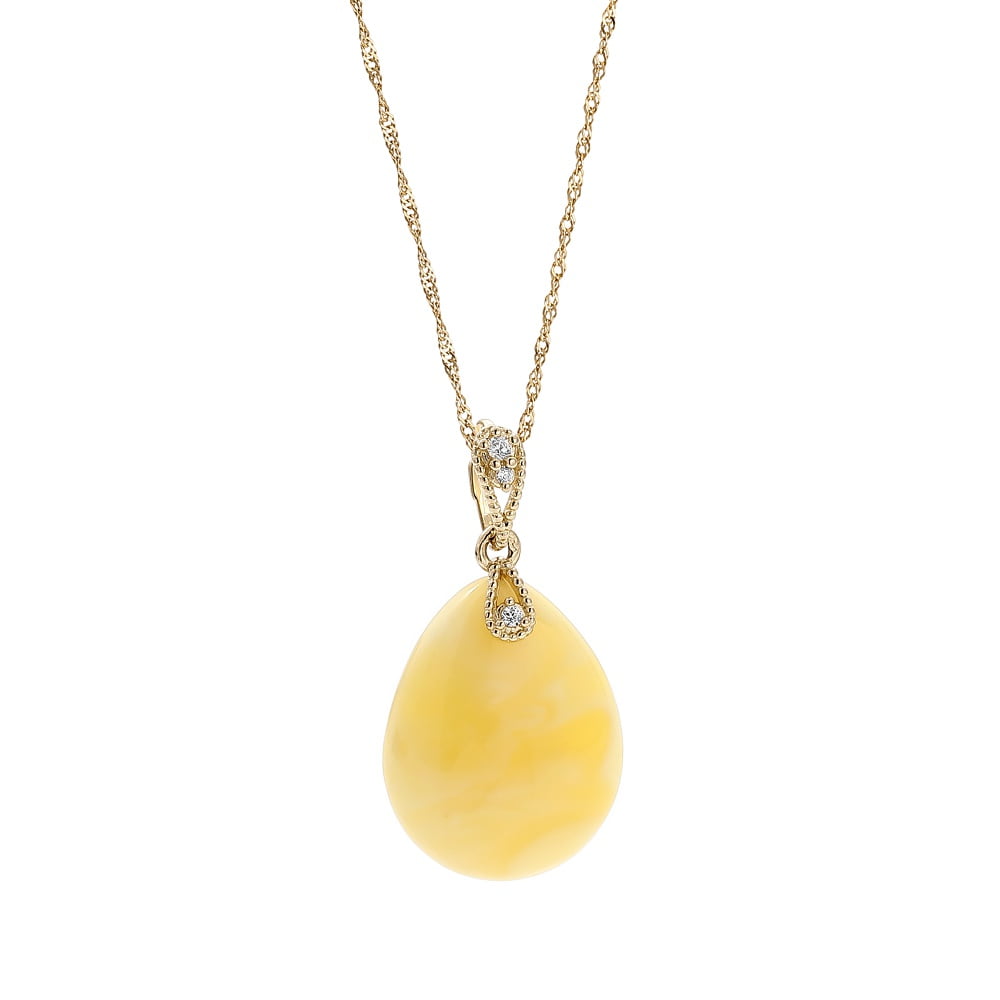 Pendant made of natural milky Baltic amber, framed in 14 carat gold, decorated with zircons.