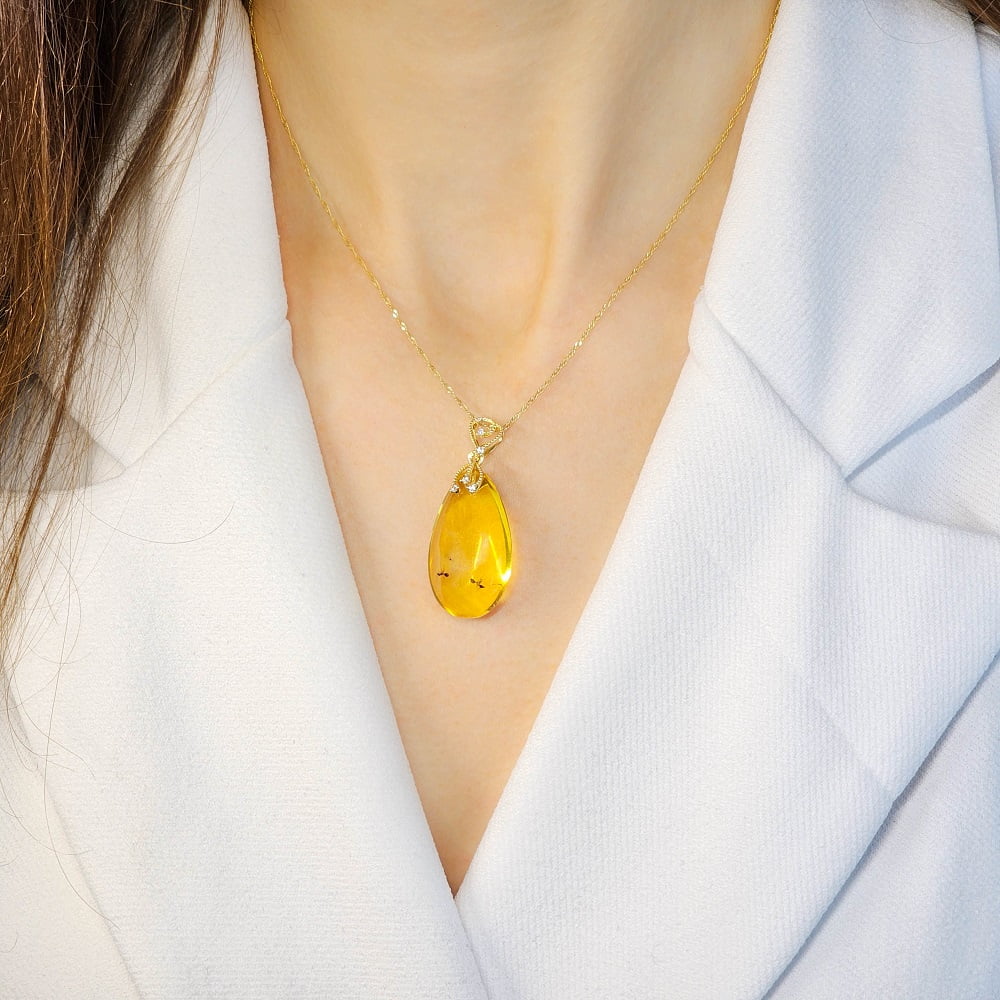 Unikatowa, zawieszka z naturalnego bursztynu bałtyckiego w kolorze przezroczystym z inkluzjami , oprawiona w 14 karatowe złoto z cyrkoniami.