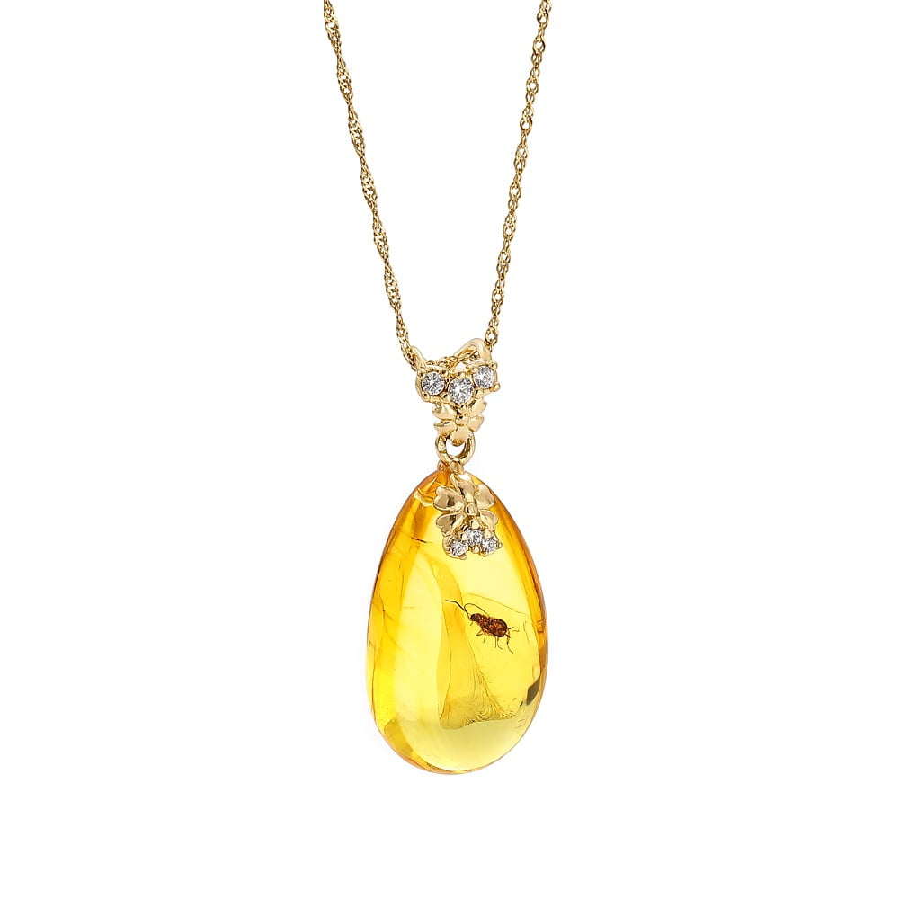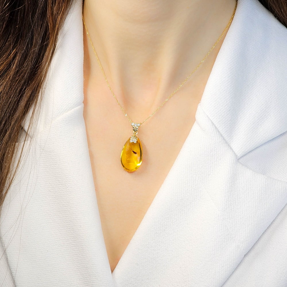 Unikatowa, zawieszka z naturalnego bursztynu bałtyckiego w kolorze przezroczystym z z inkluzją , oprawiona w 14 karatowe złoto z cyrkoniami