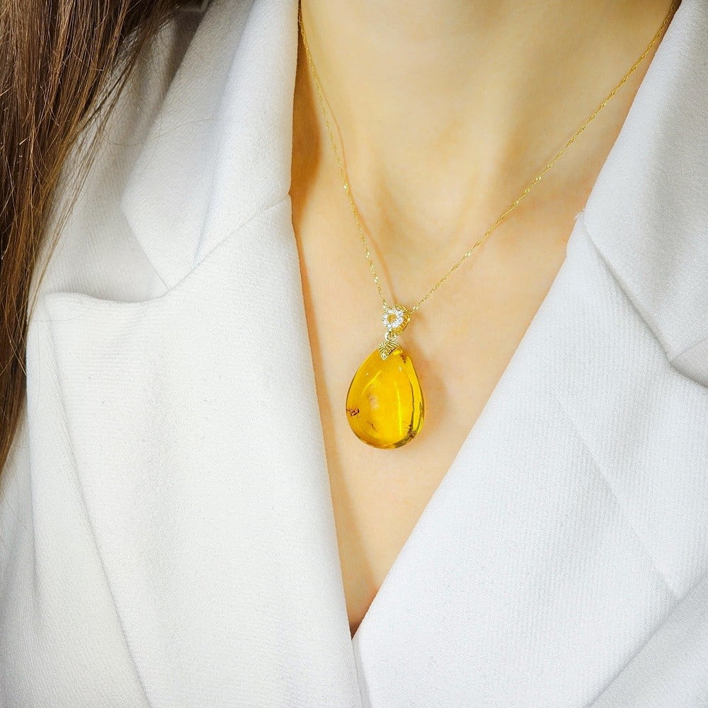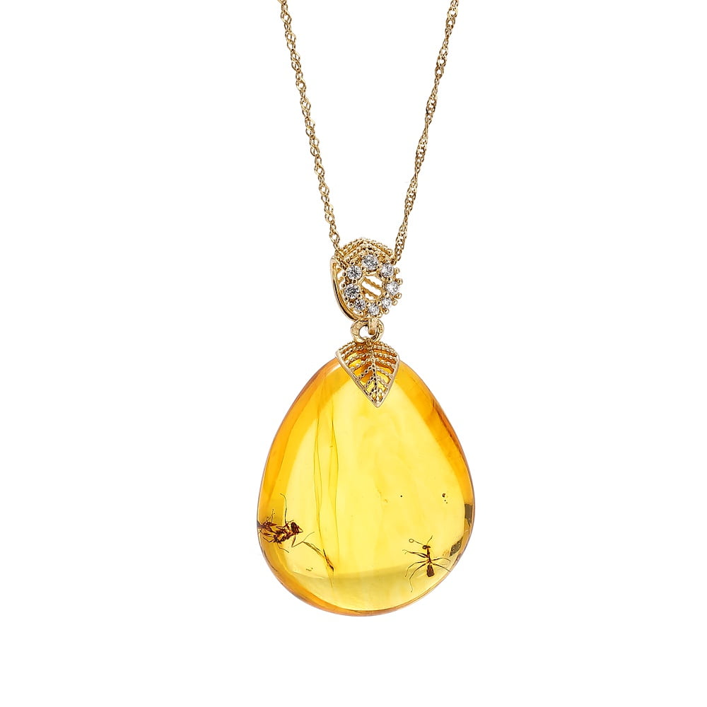 Unique pendant amber made of natural Baltic amber in a translucent color with inclusion, set in 14 carat gold decorated with cubic zircons.
