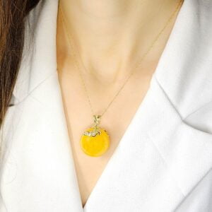 Unikatowa zawieszka z naturalnego bursztynu bałtyckiego w kolorze żółtym oprawiona w 14 karatowe złoto z cyrkoniami.