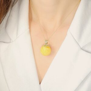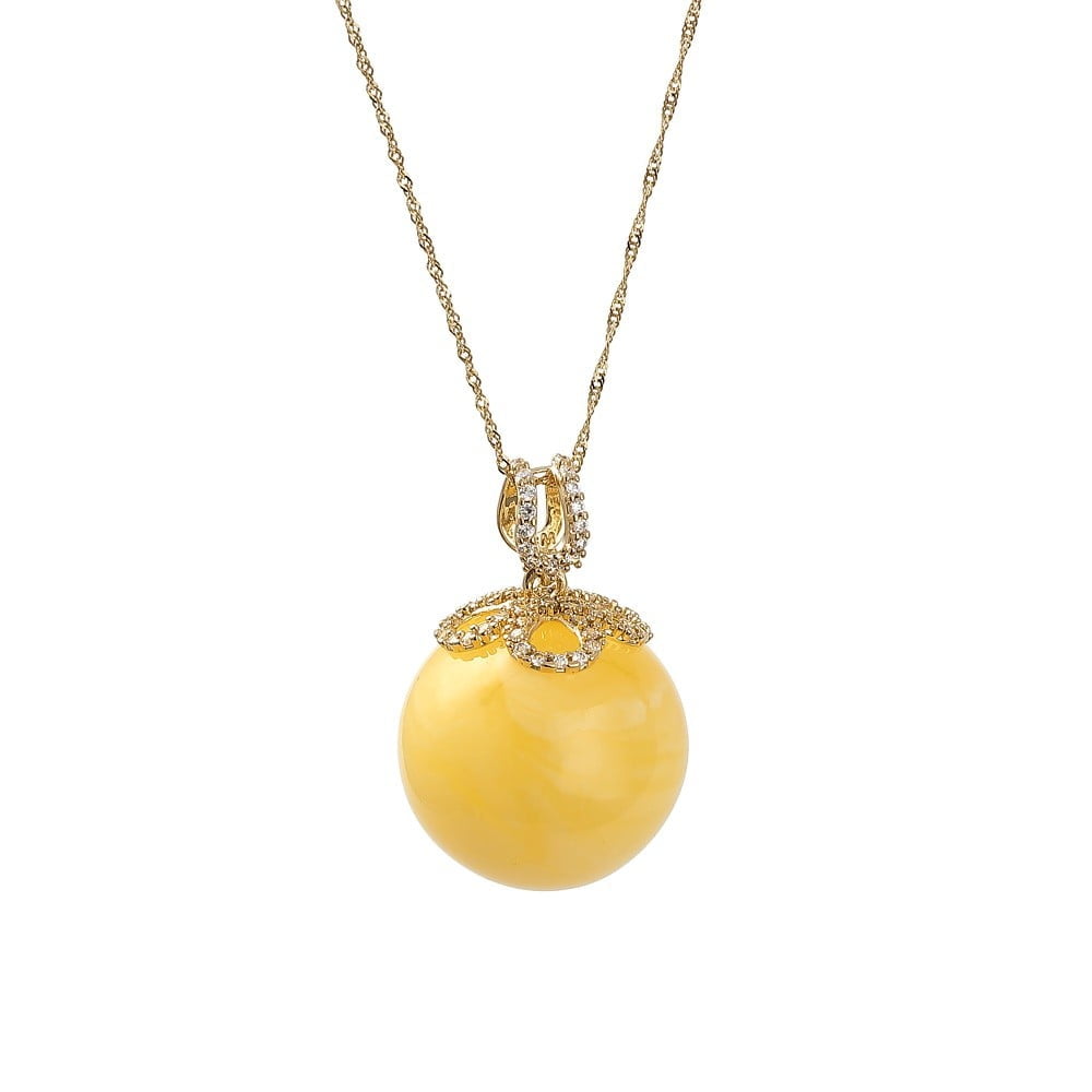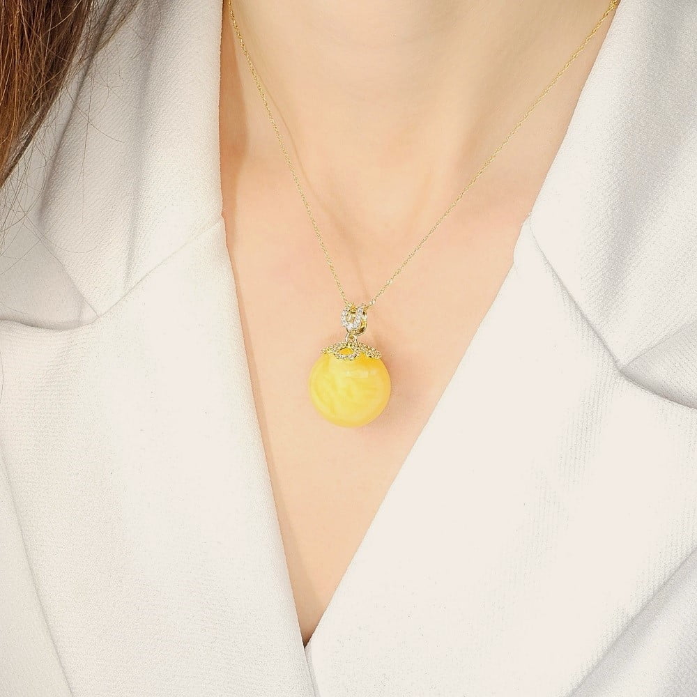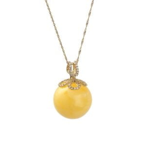 Unikatowa zawieszka z naturalnego bursztynu bałtyckiego w kolorze żółtym oprawiona w 14 karatowe złoto z cyrkoniami.
