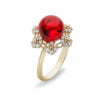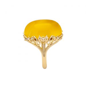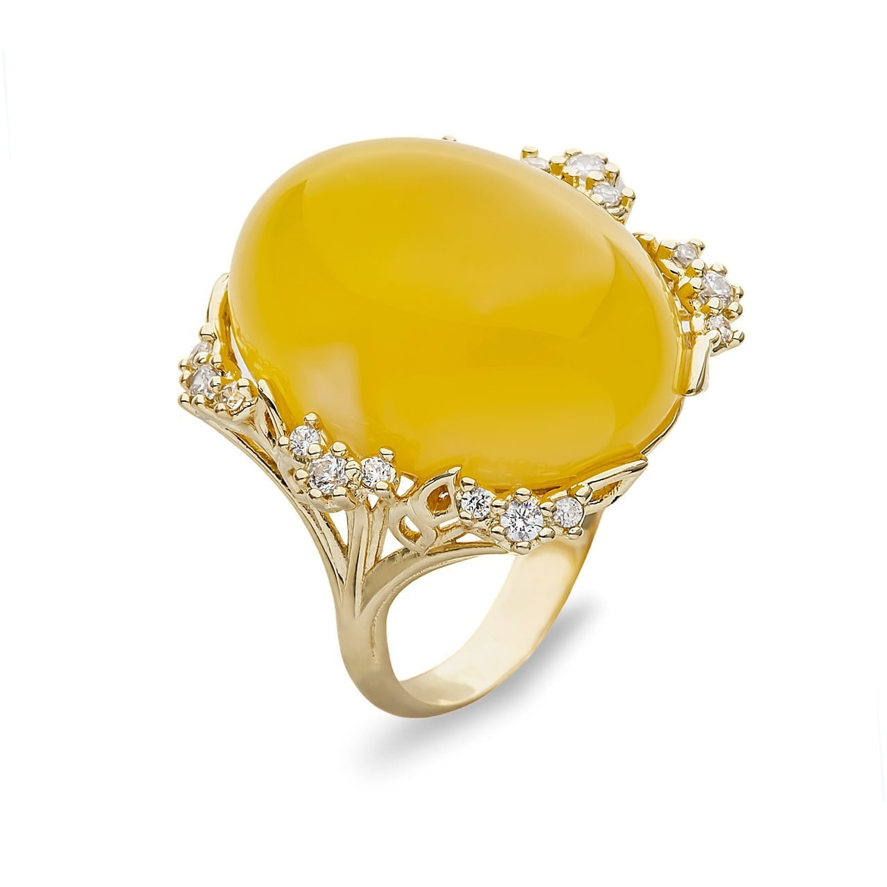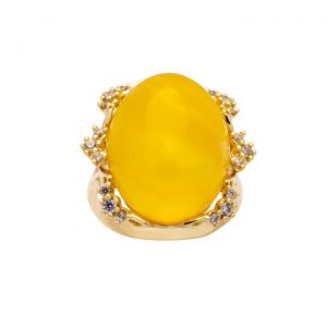 Pierścionek wykonany z 14 karatowego złota, zdobiony unikatowym naturalnym bursztynem bałtyckim w kształcie owalu w połączeniu z cyrkoniami.